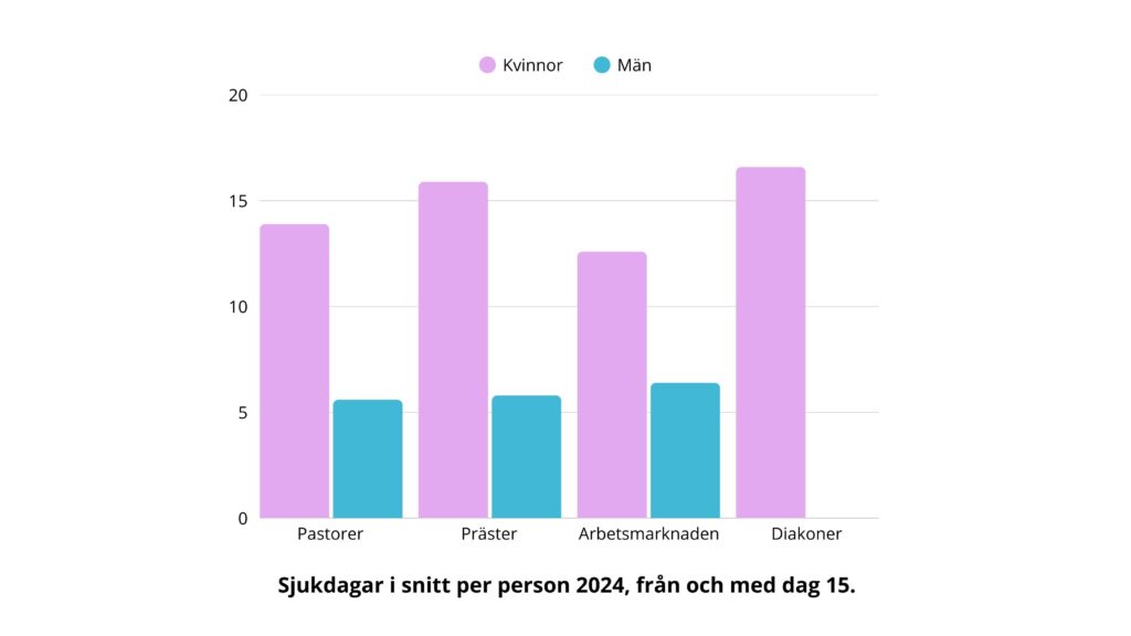 I senaste numret av Tidningen Vision lyftes Försäkringskassans senaste statistik över antalet sjukdagar i genomsnitt per anställd. Snittet på hela arbetsmarknaden var år 2024 drygt 9 dagar (utöver de första 14 dagarna då arbetsgivarna betalar sjuklön). För pastorer låg siffran på 8,7, men det är ojämnt mellan könen. De manliga pastorerna var sjukskrivna 5,6 dagar medan kvinnorna var sjukskrivna 13,9 dagar – alltså 148 procent mer än sina manliga kollegor. Och bland diakonerna ligger siffran på nästan 17 dagar. Försäkringskassan redovisade inga siffror för kvinnor respektive män, men 86 procent av diakonerna är kvinnor.